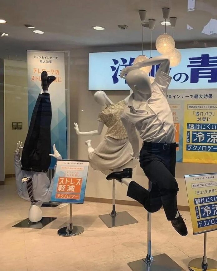 Svona eru útstillingargínurnar í veslunarmiðstöðvum víða í Asíu. Á fleygiferð, hoppandi, dansandi og jafnvel á haus. Líflegt.
